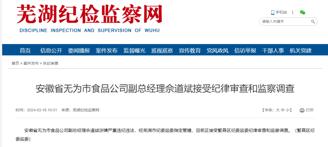 安徽省无为市食品公司副总经理佘道斌涉嫌严重违纪违法,经芜湖市纪委监委指定管辖,目前正接受繁昌区纪委监委纪律审查和监察调查。(繁昌区纪委监委)