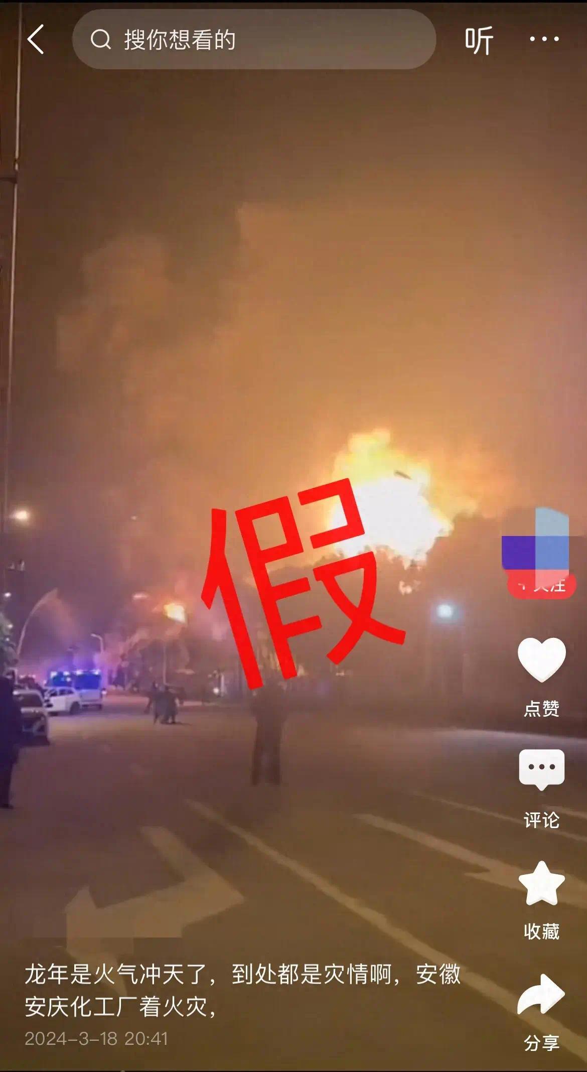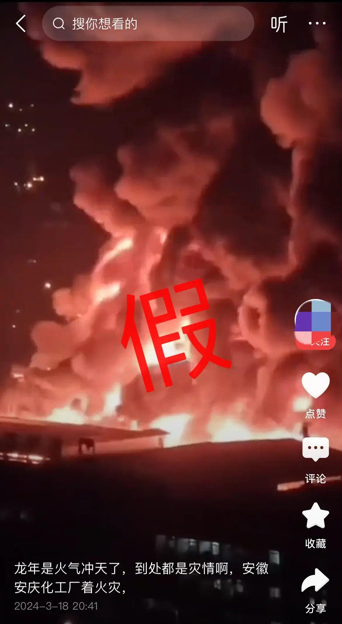 3月18日,一网民在网络平台发布火灾视频并配文“安庆化工厂发生火灾”。据市消防救援支队反馈,视频中火灾事发地不在安庆,此信息不实。