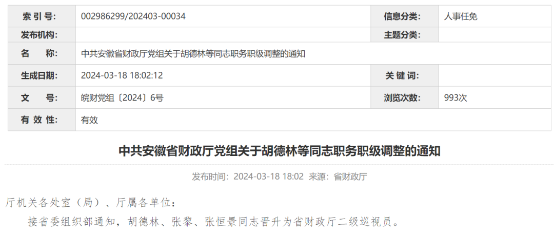 接省委组织部通知,胡德林、张黎、张恒景同志晋升为省财政厅二级巡视员。