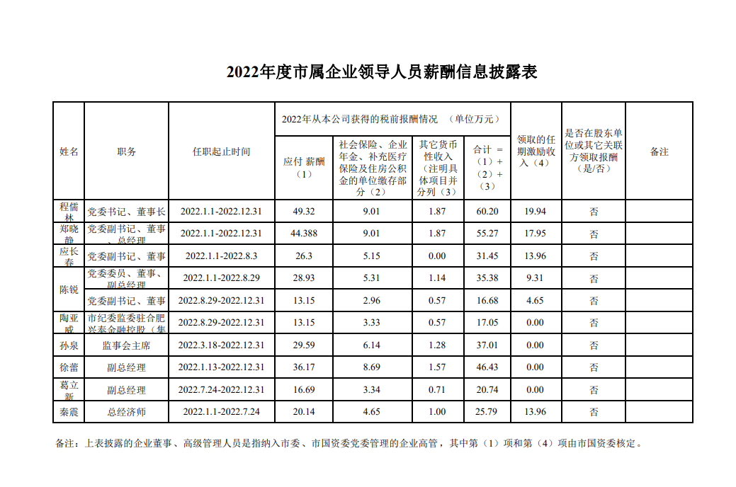 合肥产投2022年度领导人员薪酬信息披露表