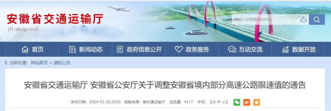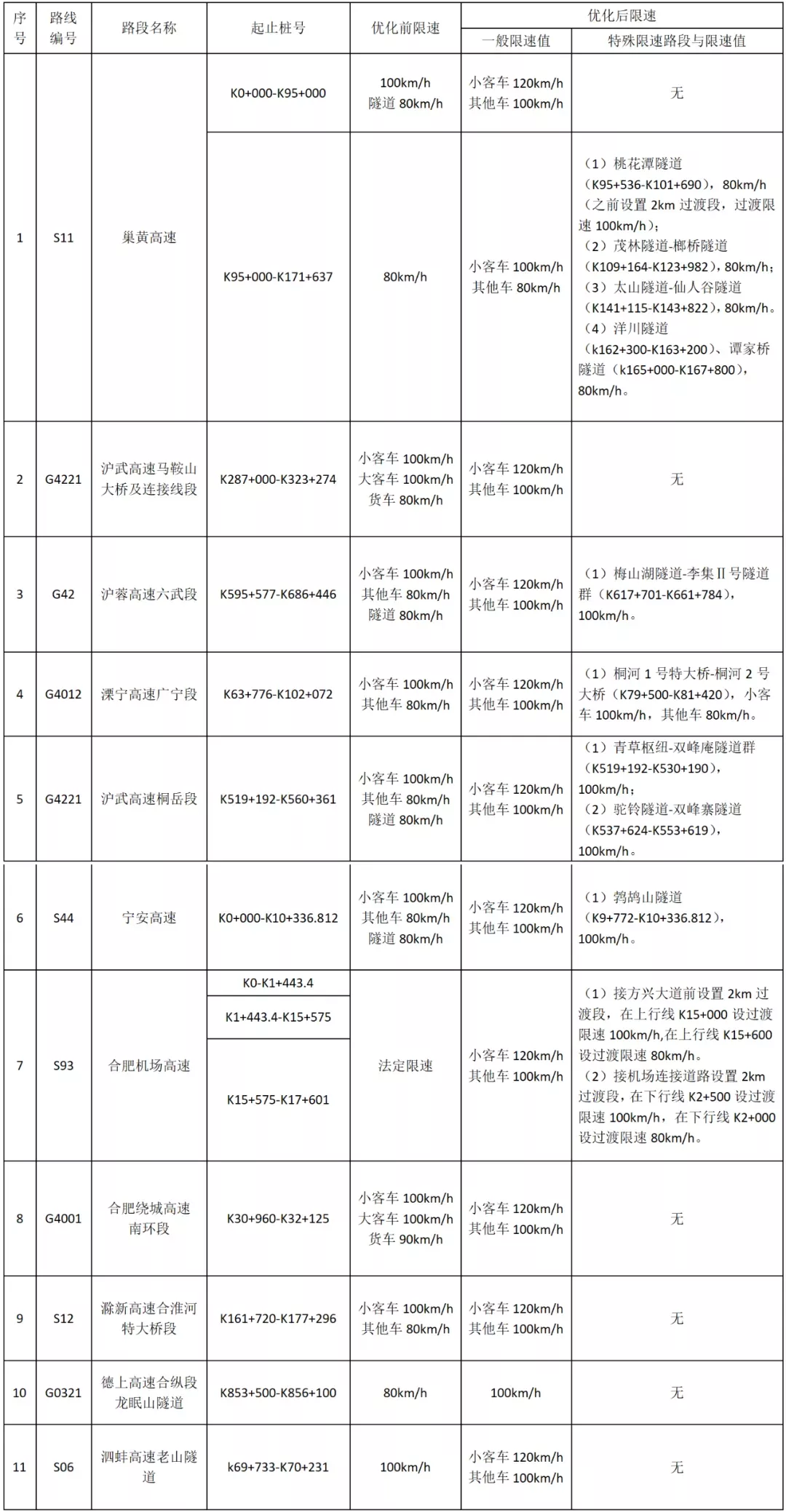 为进一步提升我省高速公路通行能力,更好地服务经济社会发展和人民群众便捷出行,根据《安徽省高速公路优化限速工作指导意见》等文件要求,安徽省交通运输厅、安徽省公安厅决定自2024年3月26日起,对巢黄高速、沪武高速马鞍山大桥及连接线段、沪武高速桐岳段、沪蓉高速六武段、溧宁高速广宁段、宁安高速、合肥机场高速等7个路段及合肥绕城高速南环段、滁新高速公路淮河特大桥段、德上高速合枞段龙眠山隧道、泗蚌高速老山隧道等4处点段限速值进行调整,相关路段沿线的限速标志、标线、交通技术监控设备参数等同步进行调整。具体调整路段情况见附表。