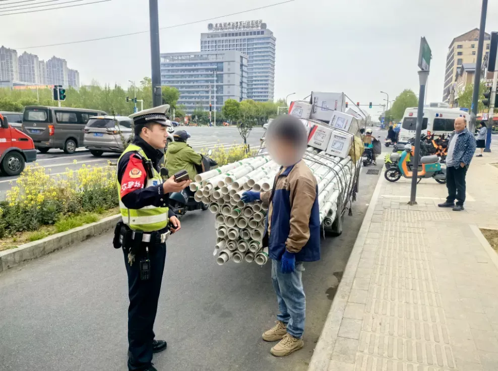 △4月11日,铜陵北路与淮海大道交口,合肥交警支队新站大队民警在对三轮车违法载货的行为进行处罚。
