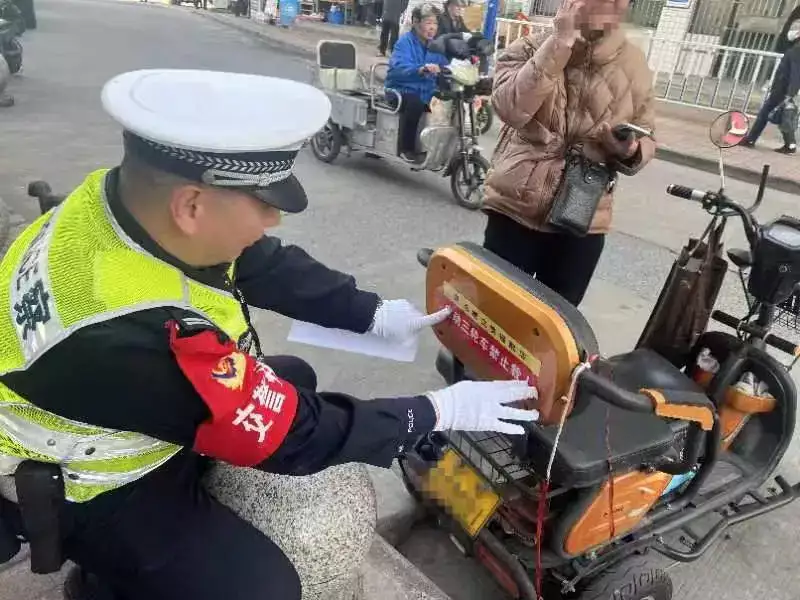 △4月9日,合肥交警支队庐阳大队在辖区路口开展非机动车违法整治,并为电动三、四轮车张贴反光提示贴。