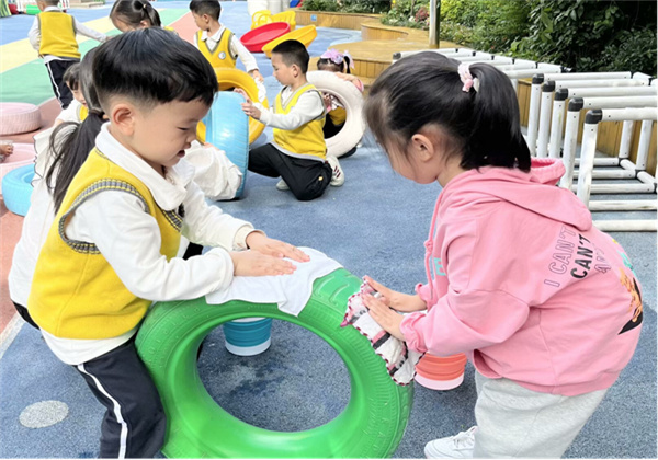 小中班小朋友们大手拉小手走出教室,争做劳动“小先锋”,用自己勤劳的小手,为幼儿园每一处的清洁贡献自己的一份力量。个个撸起袖子干劲十足,不怕苦不怕累,擦拭体育器械、给绿植浇水,感受着劳动的喜悦,也让幼儿园的每个角落焕然一新。