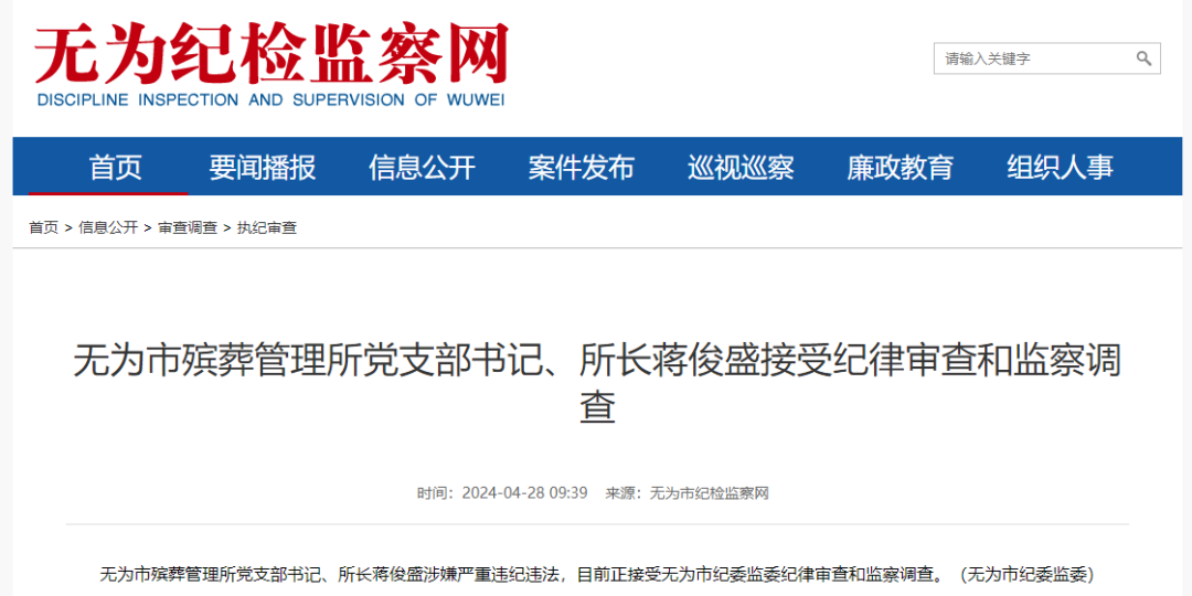 据无为纪检监察网4月28日消息,无为市殡葬管理所党支部书记、所长蒋俊盛涉嫌严重违纪违法,目前正接受无为市纪委监委纪律审查和监察调查。