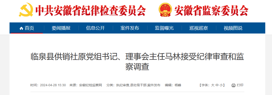 临泉县供销社原党组书记、理事会主任马林涉嫌严重违纪违法,目前正接受临泉县纪委监委纪律审查和监察调查。(阜阳市纪委监委)