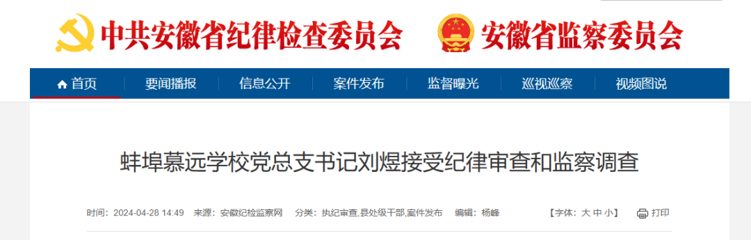 蚌埠慕远学校党总支书记刘煜涉嫌严重违纪违法,目前正接受蚌山区纪委监委纪律审查和监察调查。(蚌埠市蚌山区纪委监委)