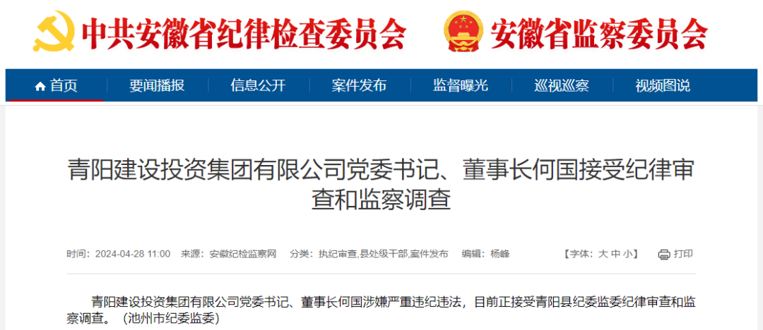 青阳建设投资集团有限公司党委书记、董事长何国涉嫌严重违纪违法,目前正接受青阳县纪委监委纪律审查和监察调查。(池州市纪委监委)
