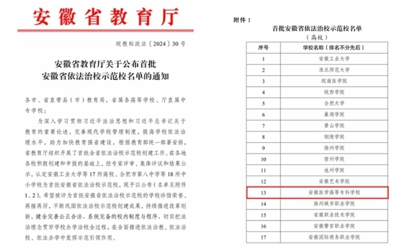 近日,安徽省教育厅公布首批“安徽省依法治校示范校名单”,安徽医学高等专科学校成功入选。