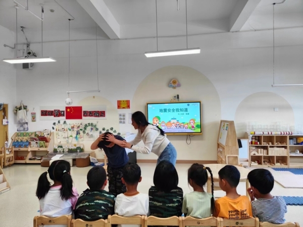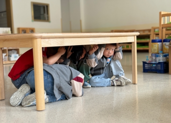 各班老师通过PPT、视频、相关图片等方式,让幼儿了解地震发生时的现象和应急避险的知识,学会基本的自护自救方法,引导幼儿警报响起时听从指挥,临“震”不慌张,安全记心中。本次防震演练特邀请第二届家、委伙委委员以及美丽家长全程参与。第一次警报铃声响起,地震应急疏散演练正式开始!全园师幼立即停止活动,以最快速度躲避到安全区域,迅速抱头、蜷曲身体,降低身体重心,躲在桌底等三角区域,保护头部,并远离窗户。随着第二声警报声响起,幼儿在老师的带领下弯腰、护头,迅速且有序沿着指定疏散路线撤离到安全区域,同时老师检查是否有掉队的孩子,确保每位幼儿安全撤离。当撤离到指定安全地点后,各班老师立刻清点人数,检查是否有受伤幼儿并向总指挥汇报人数,确保所有师生无一疏漏。