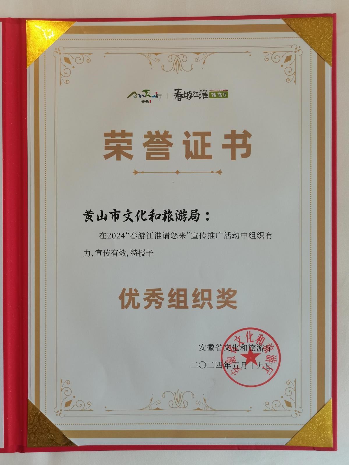 活动现场对2024“春游江淮请您来”活动进行了总结,并颁发了优秀组织奖、优秀合伙人、优秀报道奖和创意推广大赛等相关奖项,凭借系列精彩活动出圈,黄山市文化和旅游局获评优秀组织奖。