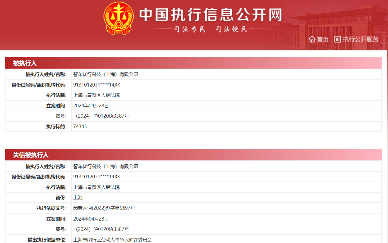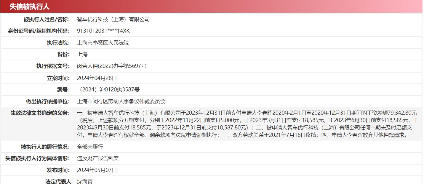 近日,据中国执行信息公开网信息,因违反财产报告制度,奇点汽车关联公司智车优行科技(上海)有限公司被列为失信被执行人。法定代表人沈海寅被限制高消费。