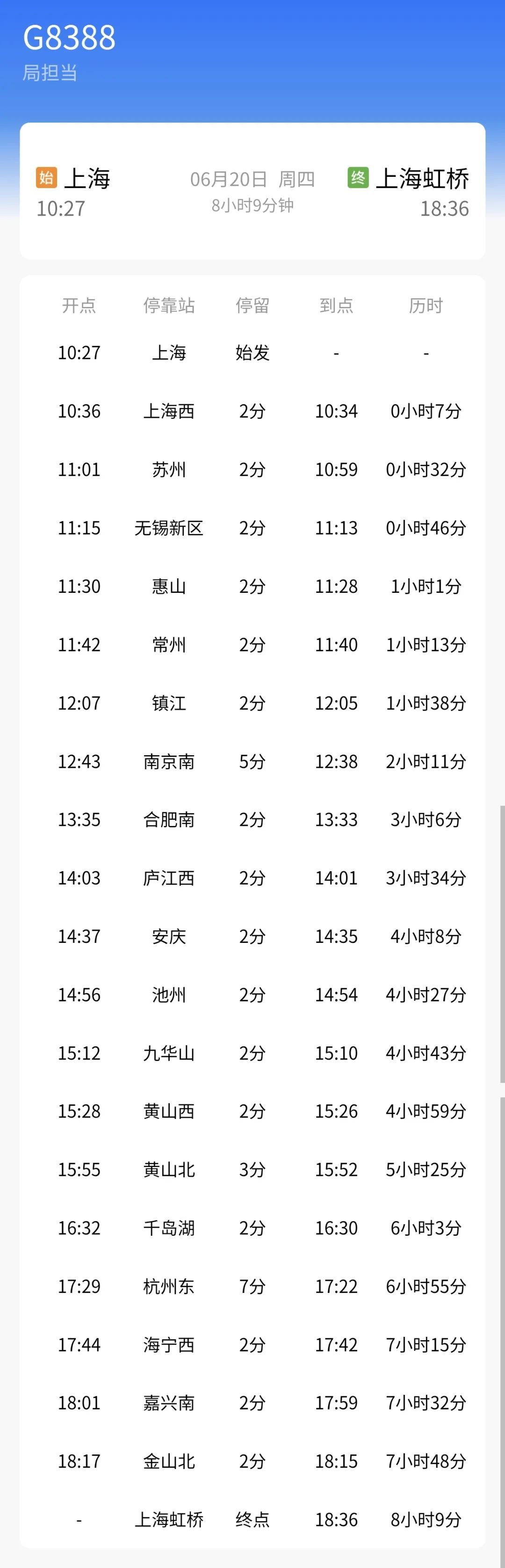 6月铁路调图后,上海站至上海虹桥站间将开行G8388次高速动车组列车。
