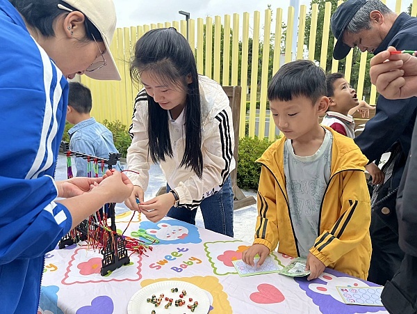 早晨,家长和孩子一起手拉手走过铺满艾草的地毯,感受淡淡粽叶香,室外活动中结合端午投壶、做绿豆糕、吃粽子等传统习俗,设置了编五彩绳、写祈福卡、做香囊、画团扇等多个趣味游戏,不仅让孩子们在玩乐中学习到端午的传统文化知识,更增进了亲子之间的默契与感情。