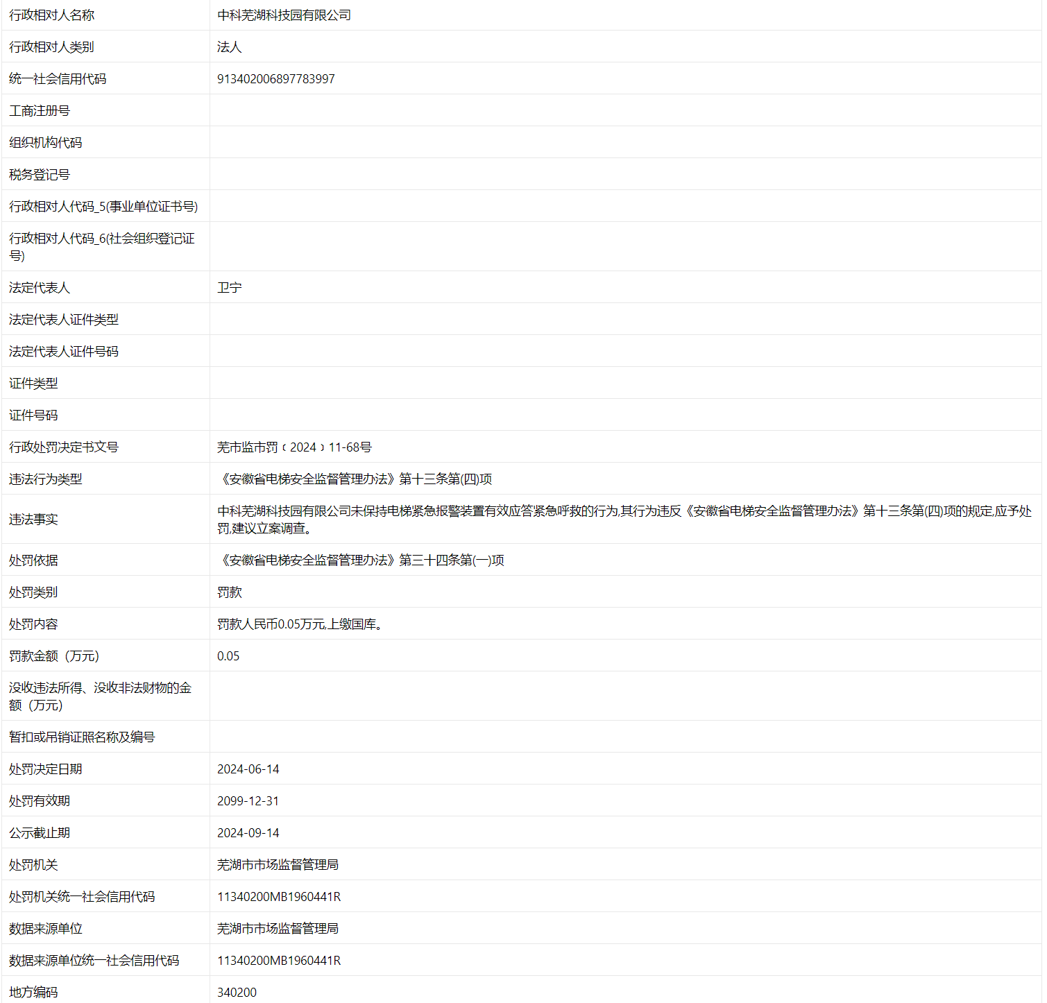 近日,信用中国(安徽芜湖)网站披露行政处罚信息,中科芜湖科技园有限公司未保持电梯紧急报警装置有效应答紧急呼救行为,其行为违反《安徽省电梯安全监督管理办法》第十三条第(四)项的规定,应予处罚,建议立案调查。芜湖市市场监督管理局对其作出罚款0.05万元的行政处罚。