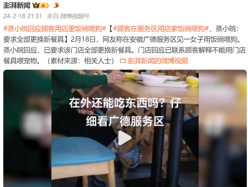 此外,据澎湃新闻报道今年2月18日,网友称在安徽广德服务区蒸小皖门店看见一女子用店里的饭碗喂狗,此事引发热议。蒸小皖此后回应称,已要求该门店全部更换新餐具。