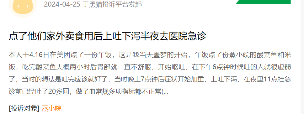 如有消费者4月25日投诉称:自己4月16日午饭在美团点了一份蒸小皖的酸菜鱼和米饭,吃完大概两小时后胃部就一直不舒服,开始呕吐,当天下午6点因呕吐人很虚弱。
