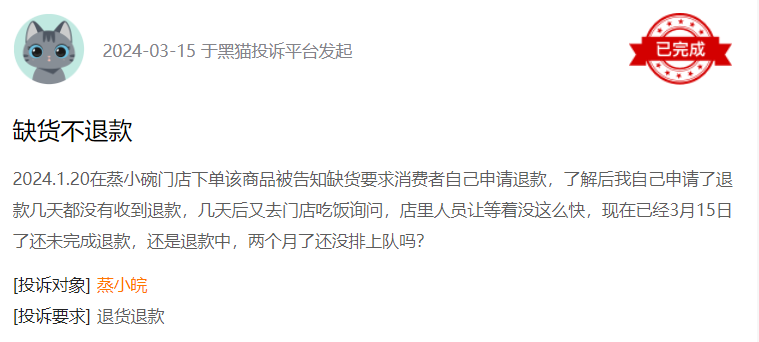 该消费者称2024年1月20日,在蒸小碗门店下单商品时被告知缺货,店方要求消费者自己申请退款。此后消费者自己申请退款,几天过去都没有收到退款。后来又去门店吃饭询问,店里人员让等着没这么快。