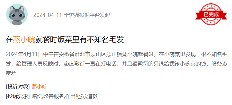 还有顾客投诉称,今年4月11日中午在安徽淮北市烈山区烈山镇蒸小皖就餐时,在小碗菜里发现一根不知名毛发。给管理人员反映时,态度敷衍一直在打电话。“并且很敷衍的只退给我该小碗菜的钱”,服务态度差。