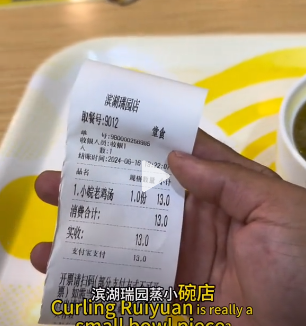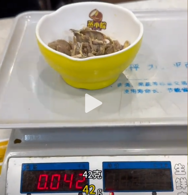 一则3分多钟的视频显示,该博主到合肥市滨湖瑞园蒸小皖门店,点了一份价值13元的小份鸡汤。在被询问鸡肉有多少时,店家开始称有60克,后来又说“菇子和鸡”一起60克。