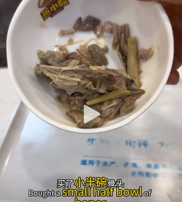 视频中,博主将汤中的菌菇去除后称重,净鸡肉(肉和骨头)只有42克。他认为花13元“买了小半碗骨头”,有些不值。