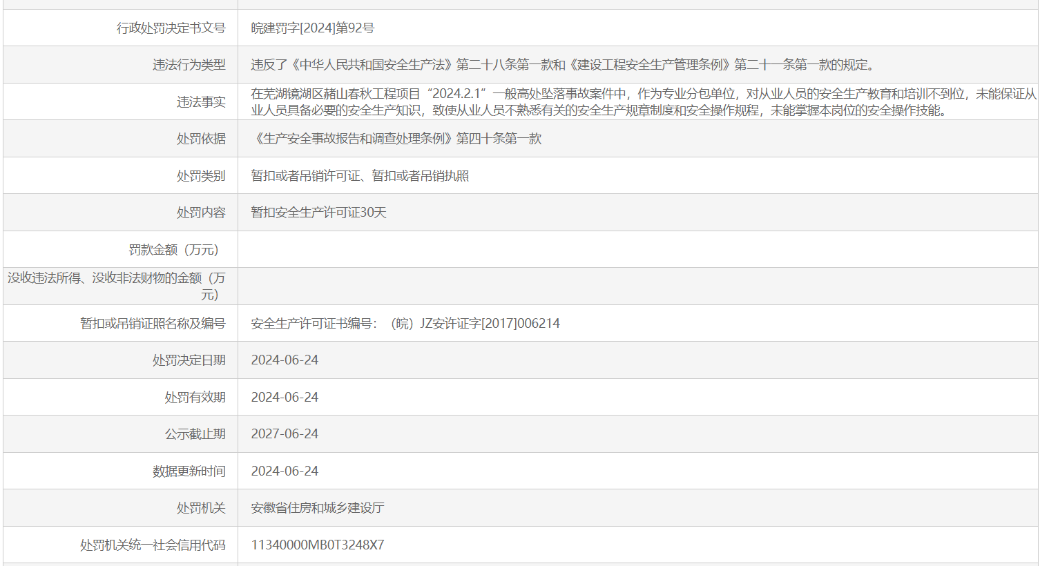 6月24日,据安徽省住建厅网站披露行政处罚信息,因涉及一起高坠事故,芜湖市华业架业有限公司,被暂扣安全生产许可证30天。行政处罚决定书文号为皖建罚字[2024]第92号。