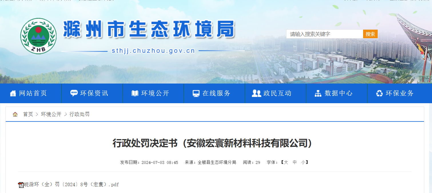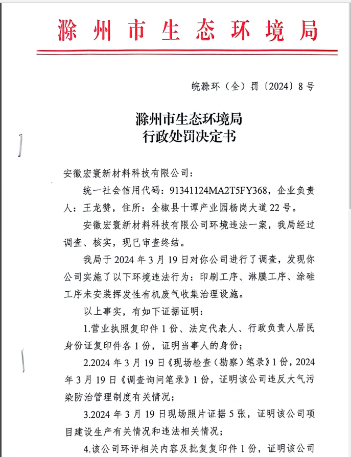7月3日,据滁州市生态环境局网站披露,安徽宏寰新材料科技有限公司在印刷工序、淋膜工序、涂硅工序未安装挥发性有机废气收集治理设施。违反了《中华人民共和国大气污染防治法》第四十五条的规定,被罚款6.68万元,行政处罚决定书文号皖滁环(全)罚(2024)8号。