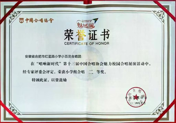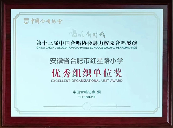 2024年7月23日,由中国合唱协会主办,浙江省合唱协会协办的第十三届“唱响新时代”中国合唱协会魅力校园合唱展演在杭州顺利闭幕。本次展演共吸引来自全国各地的78支队伍,共三千余名师生参加。合肥市红星路小学“小百灵”合唱团在小学、中学、成人、班级混合的第三组别取得了二等奖的佳绩。并且,在本次参赛的78支团队中,评选出了14支合唱团荣获了“优秀组织单位奖”荣誉称号,红星路小学小百灵合唱团有幸获此殊荣。这个奖项不仅是对于合唱展演中孩子们自信表现的肯定,更是对学生的各方面综合素养的认可和鼓励,以美育人、以美润心,用美育浸润学生的心灵。