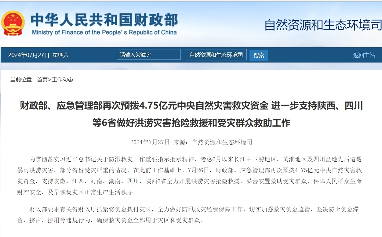 灾害,部分省份受灾严重的情况,在此前工作基础上,7月26日,财政部、应急管理部再次预拨4.75亿元中央自然灾害救灾资金,支持安徽、江西、河南、湖南、四川、陕西6省全力开展洪涝灾害抢险救援,妥善安置救助受灾群众,保障人民群众生命财产安全,及早恢复灾区正常生产生活秩序。