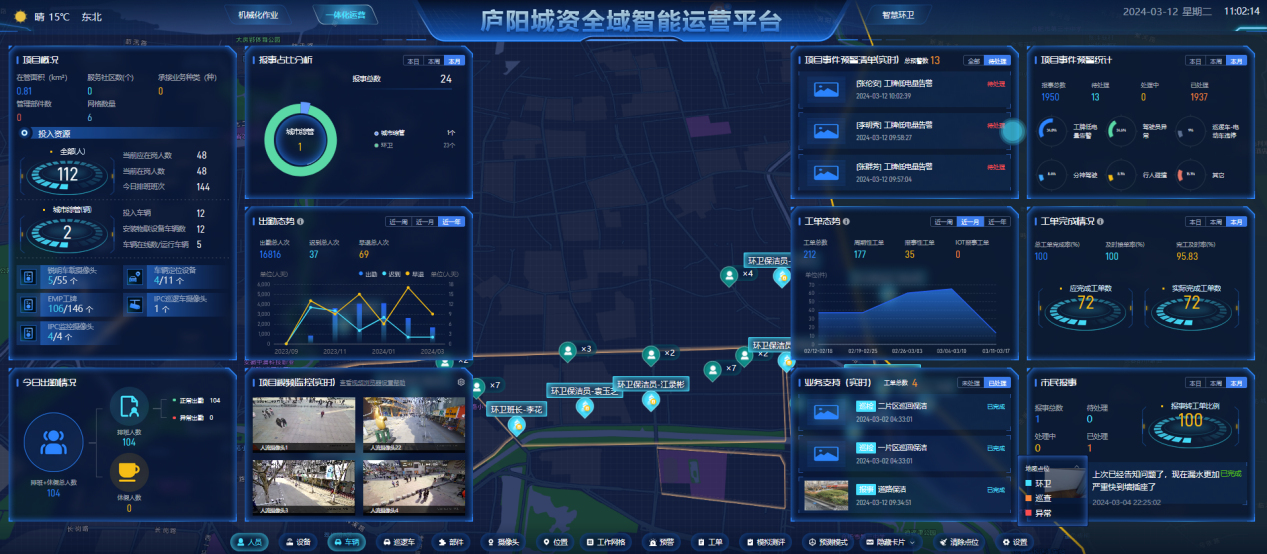 “市政+社区”一体化运营模式将区域内老旧小区、街巷打包为一个大物业服务区域,以钢苑新村为中心,打造智慧平台作为统一调度指挥中心,“一条光纤”将零散小区道闸及监控设备接入指挥中心,实现可视化远程对讲,远程开闸、远程语音、远程缴费、市民报事处理等操作;服务空间内,市政道路与各小区实现机械设备、工作人员共享,另设5G巡逻车、智能AI摄像头等多种物联设备进行街区巡检,并形成“工单”报事系统,安排巡保人员及突击队伍,完成“发现-报事-协调-监督-关单-评价”的报事闭环,快速响应,解决现场难题,打造人机协同的基层治理体系,提升城市服务效率。