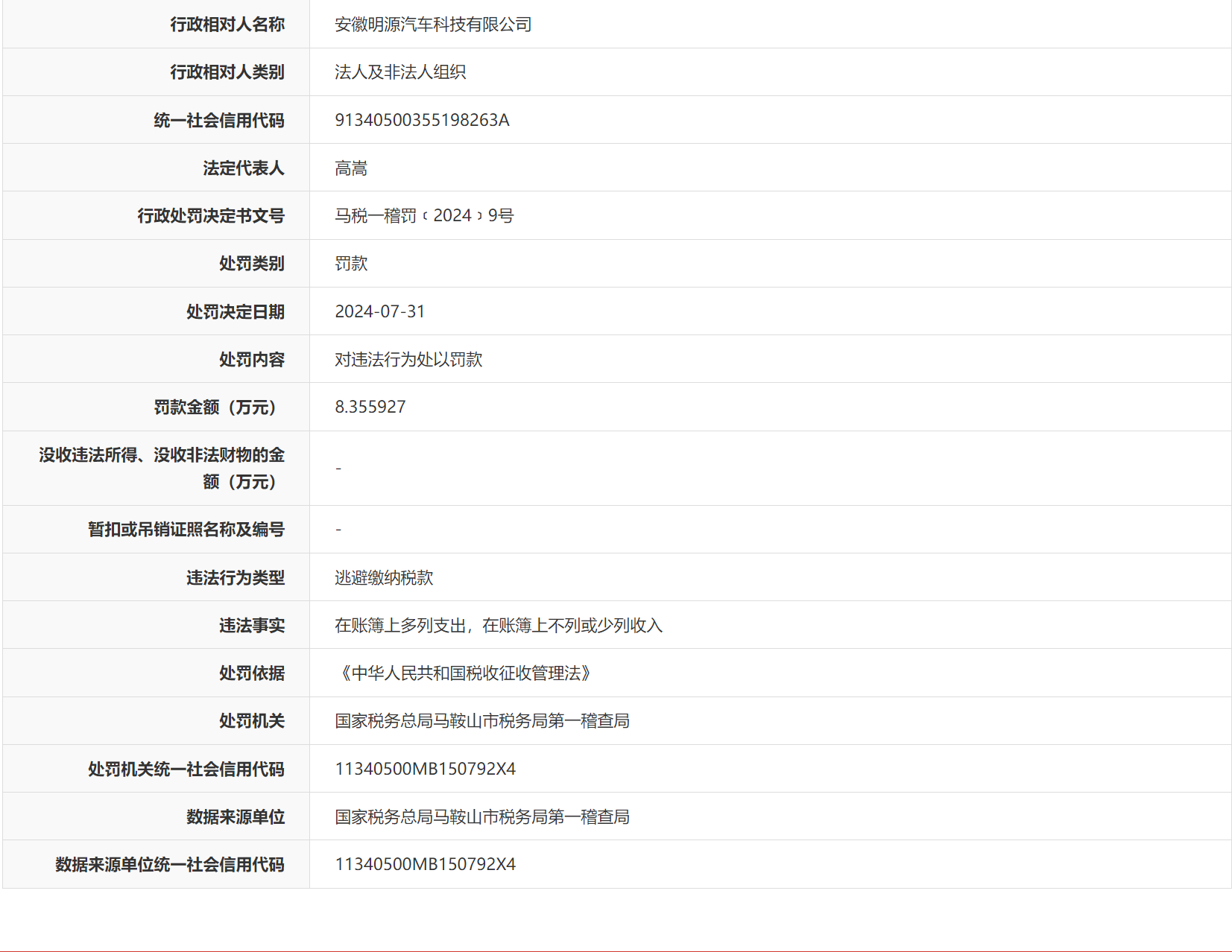 8月1日,信用安徽网站披露行政处罚信息,安徽明源汽车科技有限公司因逃避缴纳税款被罚款8.355927万元,其在账簿上多列支出,在账簿上不列或少列收入。行政处罚决定书文号马税一稽罚﹝2024﹞9号。