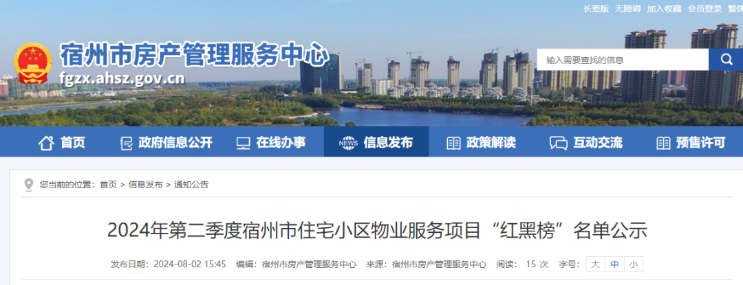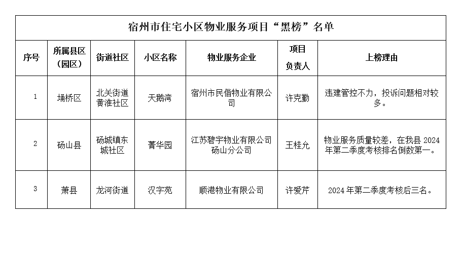 2024年第二季度宿州市住宅小区物业服务项目“红黑榜”名单公示