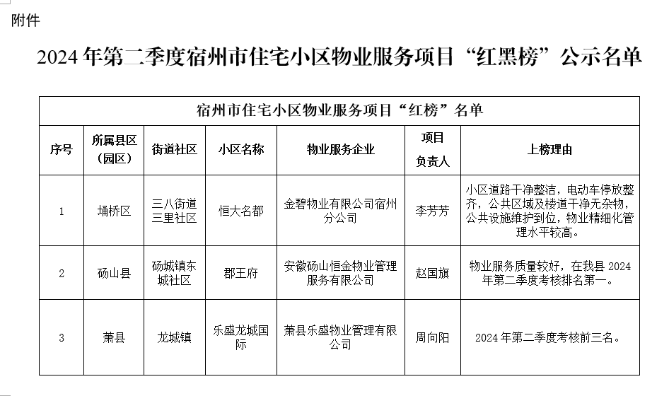 附件:2024年第二季度宿州市住宅小区物业服务项目“红黑榜”公示名单