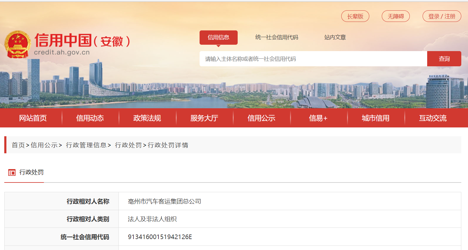 据信用安徽网站8月6日披露信息,亳州市汽车客运集团总公司客运经营者客运班车因不按批准的配客站点停靠案(车船号:皖SG3020)被罚款0.1万元,行政处罚决定书文号皖亳谯交罚﹝2024﹞1000101号。