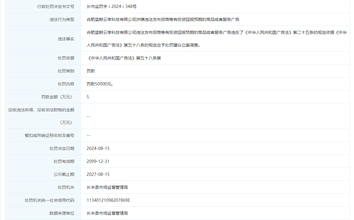 据信用合肥网站近日披露信息,合肥蓝鲸云享科技有限公司因违法发布招商等有投资回报预期的商品或者服务广告被罚款5万元,该行为违法了《中华人民共和国广告法》第二十五条的规定依据《中华人民共和国广告法》第五十八条的规定应予处罚建议立案调查。行政处罚决定书文号为长市监罚字﹝2024﹞348号。