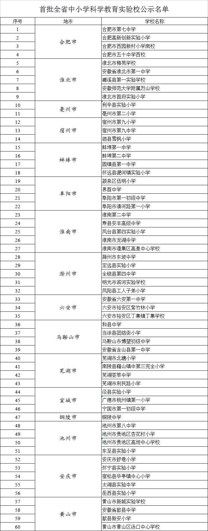 根据《安徽省教育厅关于开展首批全省中小学科学教育实验区、实验校申报推荐工作的通知》(皖教监管〔2024〕31号)精神,经自主申报、市县审核推荐、省教育厅评审等程序,合肥市瑶海区等10个区拟入选首批全省中小学科学教育实验区,合肥市第七中学等60所学校拟入选全省中小学科学教育实验校。现予以公示。