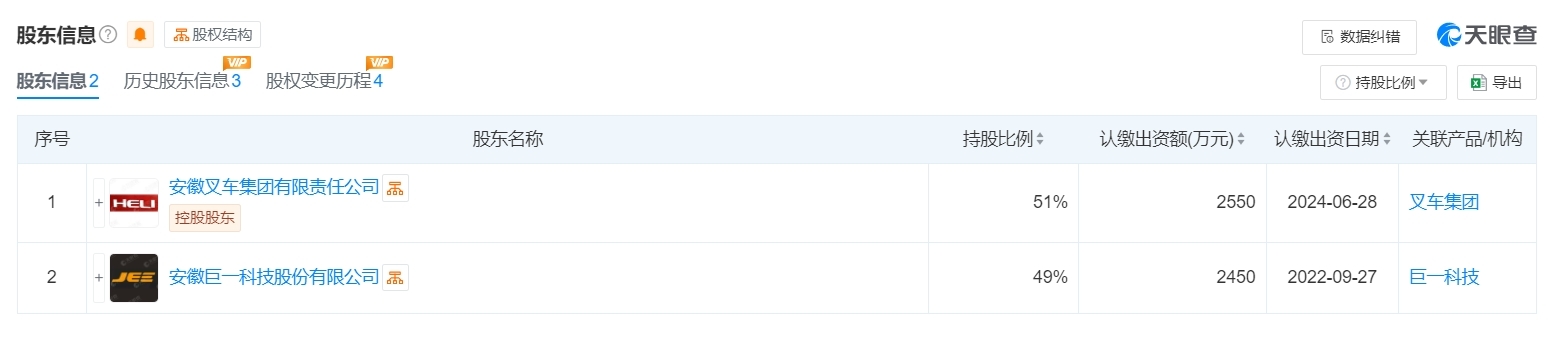 天眼查信息显示,安徽江淮重型工程机械有限公司成立于2003年,位于安徽省合肥市,是一家以从事汽车制造业为主的企业。企业注册资本5000万人民币,实缴资本5000万人民币。股权穿透信息显示,该公司由安徽叉车集团有限责任公司控股,持股比例51%,安徽巨一科技股份有限公司参股,持股比例49%。