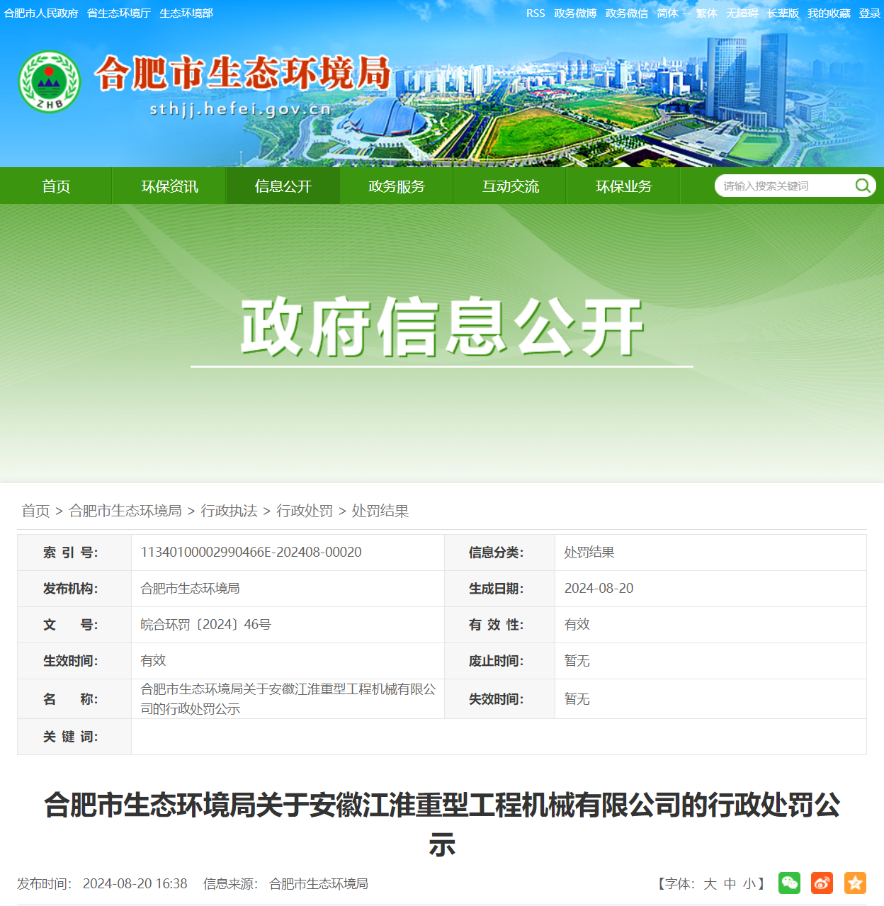 近日,合肥市生态环境局网站披露行政处罚信息,因涉环境违法安徽江淮重型工程机械有限公司被罚款2万元,行政处罚决定书为皖合环罚〔2024〕46号。