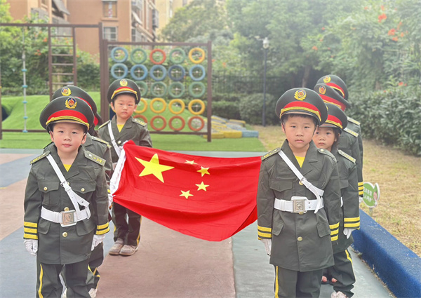 庄严的升旗仪式中,拉开了新学期的序幕。大一班小小护旗手们伴随激昂的音乐,护卫着鲜艳的五星红旗,迈着铿锵有力的步伐向前走去。在嘹亮的国歌声中五星红旗缓缓升起,鲜艳的五星红旗在天空中飘扬。