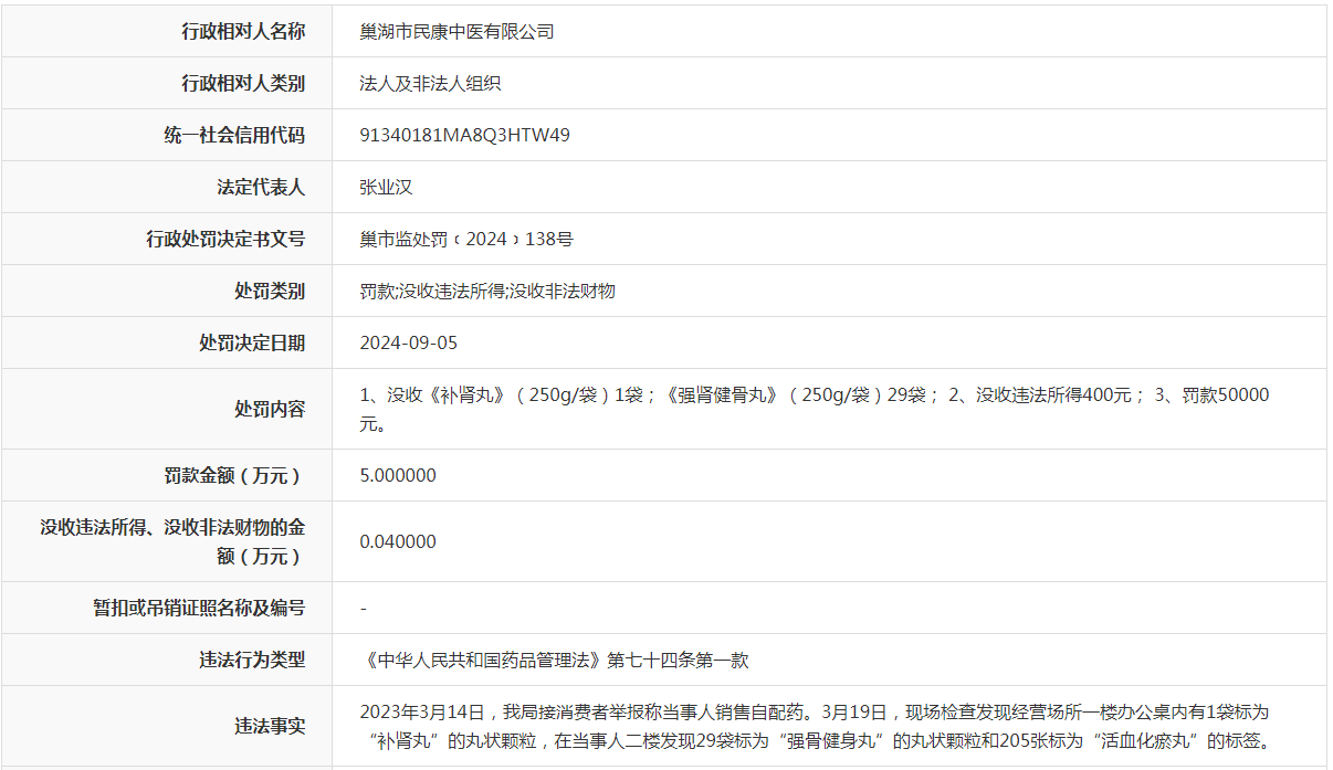 公开处罚信息显示,2023年3月14日,巢湖市市场监督管理局接消费者举报称当事人销售自配药。3月19日,现场检查发现经营场所一楼办公桌内有1袋标为“补肾丸”的丸状颗粒,在当事人二楼发现29袋标为“强骨健身丸”的丸状颗粒和205张标为“活血化瘀丸”的标签。