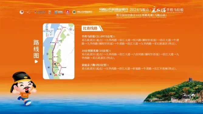 本次赛事途经坐落于滨江沿线的采石矶公园、滨江文化公园、薛家洼生态园、小九华寺等优美景区,是具有鲜明江岸特色的马拉松赛道。