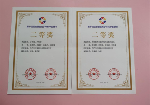 由安徽省青少年科技活动中心、安徽省青少年科技教育协会主办的第十四届安徽省青少年科学影像节圆满落幕。合肥市红星路小学国际部校区四年级陈文郁、李芮涵、张徐诺、毛艺儒同学制作的科学微电影《不同颜色衣服吸热和散热能力》;张悠然、朱昌宇、方昊然、查瑾瑜制作的科学微电影《小饮食,大科学》获第十四届安徽省青少年科学影像节活动作品评选二等奖。