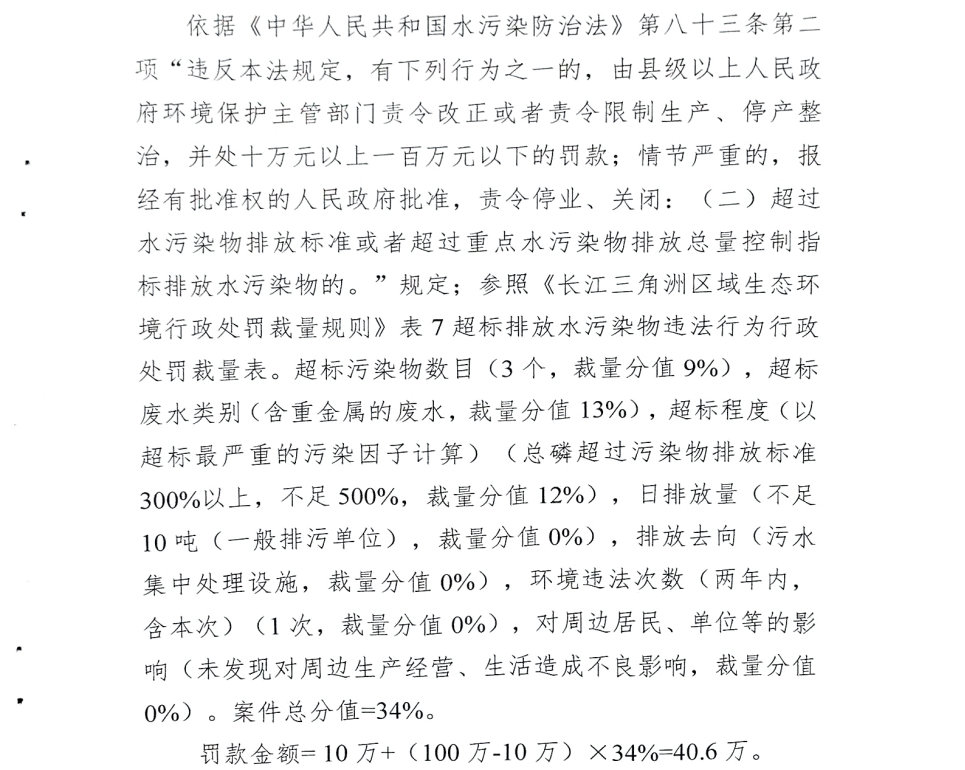 依据《中华人民共和国水污染防治法》第八十三条第二项的规定,参照《长江三角洲区域生态环境行政处罚裁量规则》表7超标排放水污染物违法行为行政处罚裁量表。滁州市生态环境局决定对该公司处罚款40.6万元。