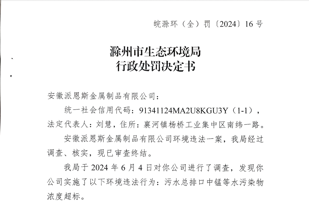 9月13日,滁州市生态环境局披露行政处罚信息,因污水排放中严重污染物超标,安徽派恩斯金属制品有限公司被罚款40.6万元。行政处罚决定书文号为皖滁环(全)罚(2024)16号。