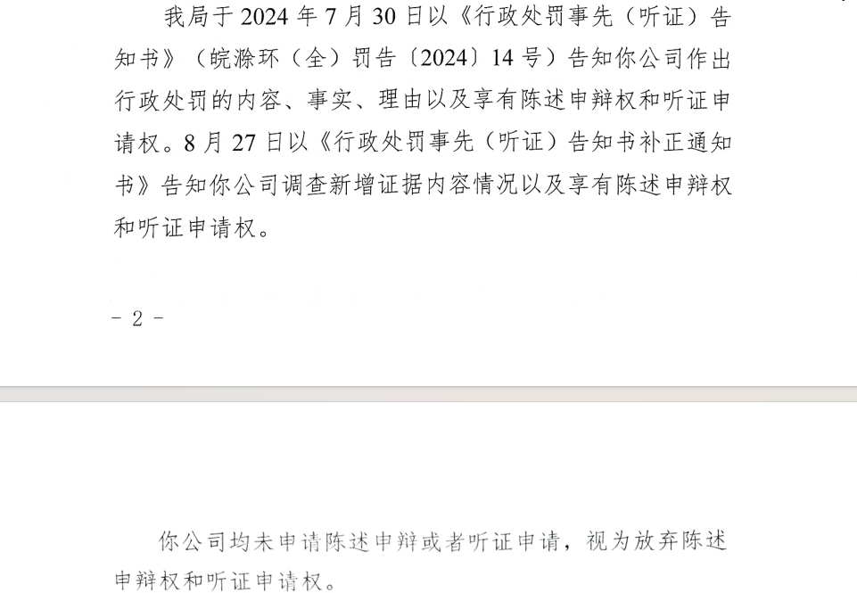 滁州市生态环境局于2024年7月30日以《行政处罚事先(听证)告知书》(皖滁环(全)罚告(2024)14号)告知你公司作出行政处罚的内容、事实、理由以及享有陈述申辩权和听证申请权。8月27日以《行政处罚事先(听证)告知书补正通知书》告知你公司调查新增证据内容情况以及享有陈述申辩权和听证申请权。