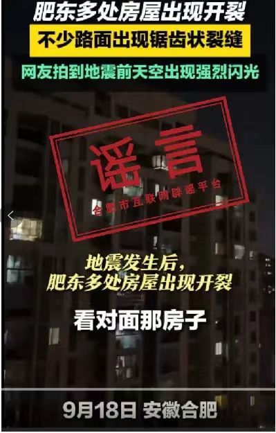 地震发生后,有网民发布视频称,合肥某高层住宅被震开裂,不少路面出现锯齿状裂缝。经核实,该视频为拼接剪辑视频,未发现因地震导致多处路面出现裂缝的情况;视频中高层建筑之间的缝隙为建筑伸缩缝,并非因地震导致。