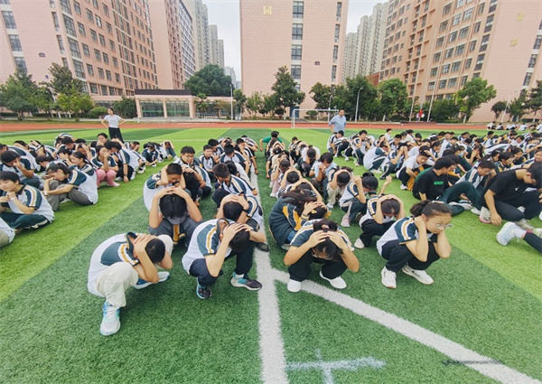 9时35分,指挥长宣布演练开始,第一轮警报响起,声音撕裂长空,学生们沉着冷静,按照既定的疏散方案和路线,用手护住头部,在老师们的指挥下有序而迅速地撤离到安全区域。9时45分,第二轮警报拉响,应急避险正式开始,全体师生按照演练要求,紧急避险。整个演练过程快而不乱,井然有序,充分体现了合肥一六八陶冲湖中学师生良好的组织纪律性和应急反应能力。9时48分在全部清点完人数,做到无一遗漏后,全体师生默哀一分钟,向在世界反法西斯战争中和抗击日本侵略中的死难者表达哀悼。9时51分举行庄严的升旗仪式,向伟大祖国表达敬意和热爱之情。