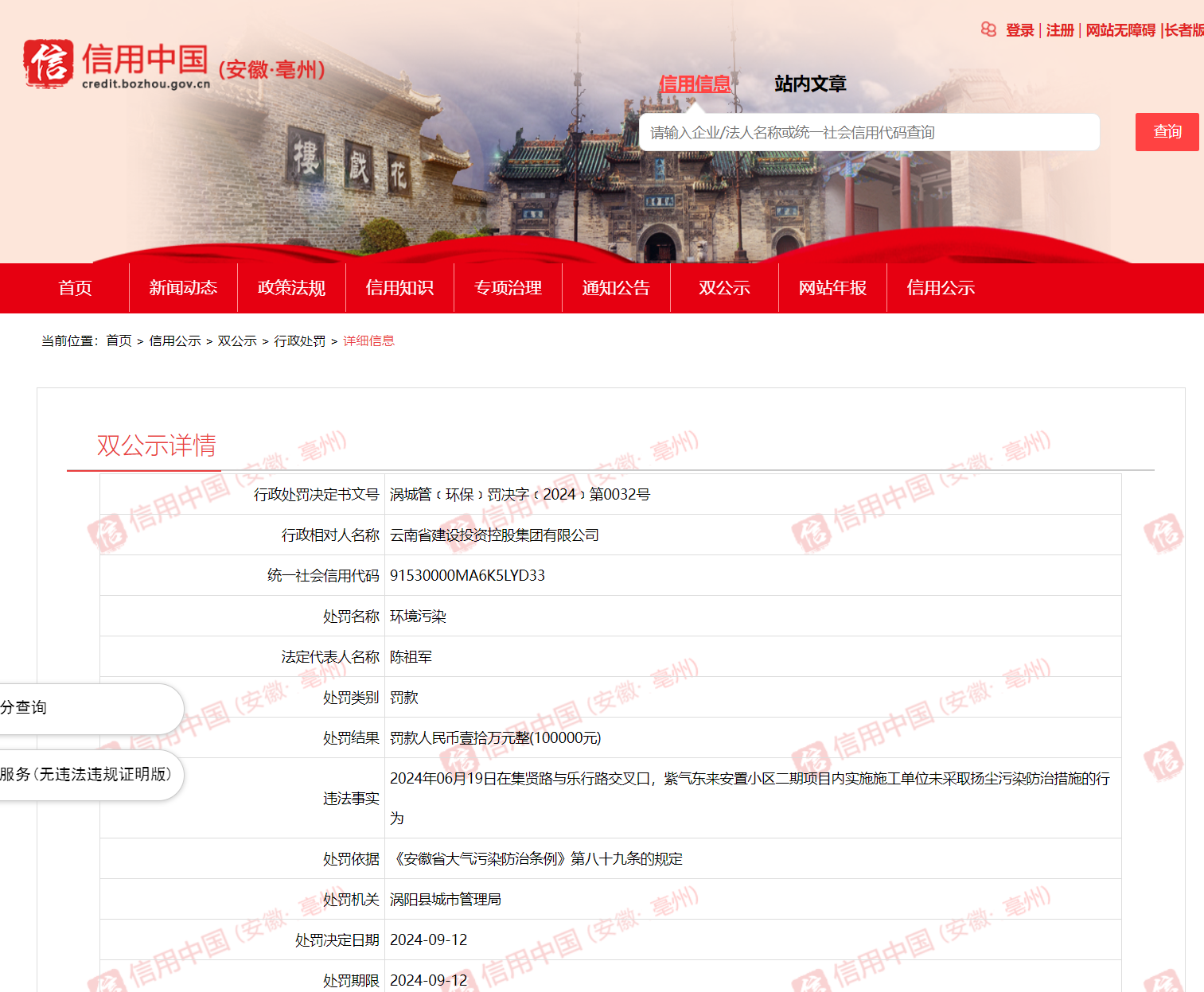 据信用亳州近日披露行政处罚信息,因涉环境违法,云南省建设投资控股集团有限公司被罚款100000元,行政处罚决定书文号为涡城管﹝环保﹞罚决字﹝2024﹞第0032号。