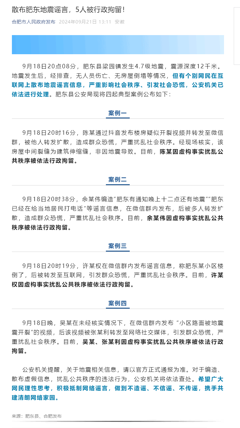 肥东4.7级地震发生后,有个别网民在互联网上散布地震谣言信息,严重影响社会秩序、引发社会恐慌,目前已被公安机关依法进行处理。