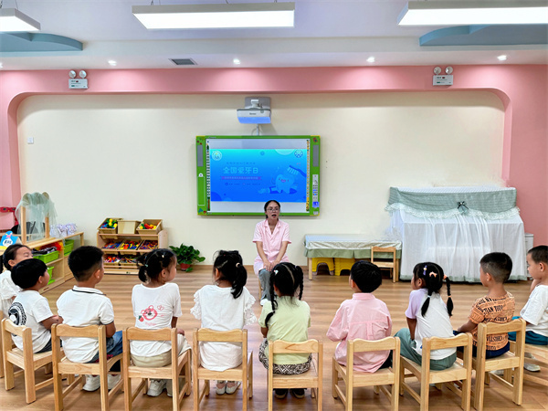 为了加强幼儿对口腔健康的认识,培养良好的口腔卫生习惯。保健医李闪闪老师走进班级给孩子们介绍牙齿的结构、牙齿的保护方法和正确的刷牙方法,通过实物展示和互动游戏,孩子们了解了保护牙齿的重要性。